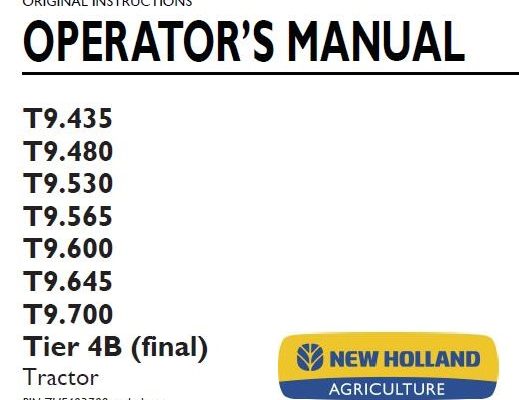 This is Complete Operator's Manual for New Holland T9.435, T9.435, T9.530, T9.565, T9.600, T9.645, T9.700 Tier 4B (final) Tractor. Your machine has been designed and built to the highest…