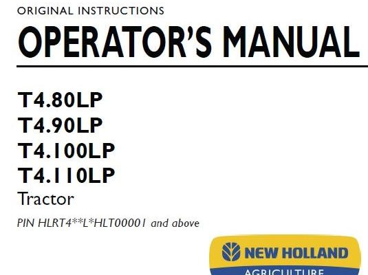 New Holland T4.80LP, T4.90LP, T4.100LP, T4.110LP Tractor Operator’s Manual ( PIN HLRT4**L*HLT00001 and above )
