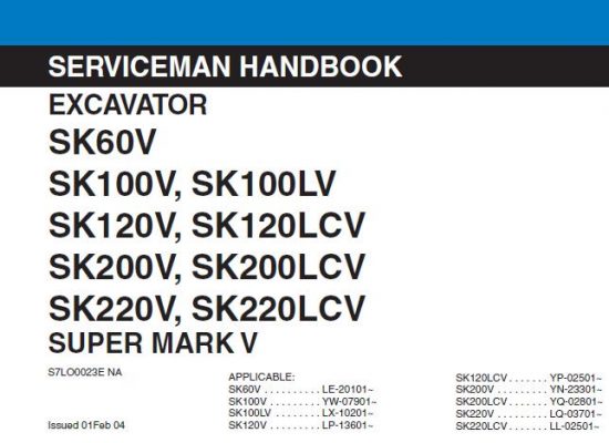 Kobelco SK60V, SK100V, SK100LV, SK120V, SK120LCV, SK200V, SK200LCV, SK220V, SK220LCV Super Mark V Excavator Serviceman Handbook