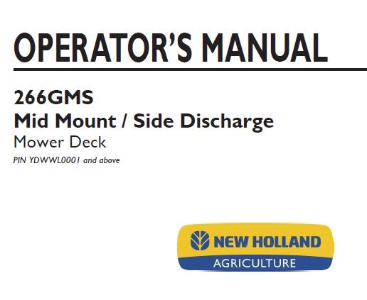 This is Complete Operator’s Manual for New Holland 266GMS Mid Mount / Side Discharge Mower Deck .