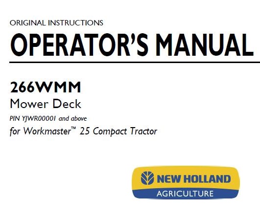 This is Complete Operator’s Manual for New Holland 266WMM Mower Deck ( for Workmaster™ 25 Compact Tractor ).