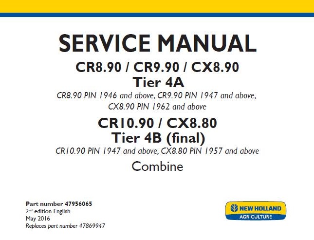This highly detailed digital repair manual covers all repairs, servicing and troubleshooting procedures. All technical details taken directly from the manufacturer can be found in this manual. New Holland CR8.90 / CR9.90 / CX8.90 Tier 4A & CR10.90 / CX8.80 Tier 4B (final) Combine Service Repair Manual is the same manual used by professional technicians, mechanics and workshops around the world