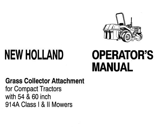 This is Complete Operator’s Manual for New Holland Grass Collector Attachment for Compact Tractorswith 54 & 60 inch 914A Class I & II Mowers.