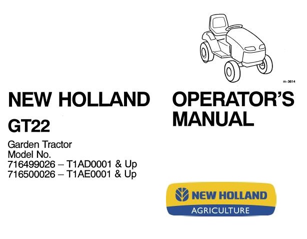 This is Complete Operator’s Manual for New Holland GT22 Garden Tractor .