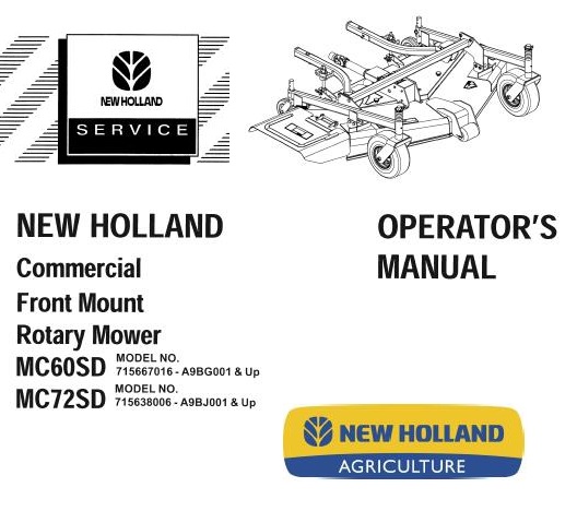This is Complete Operator’s Manual for New Holland MC60SD, MC72SD Commercial Front Mount Rotary Mower.