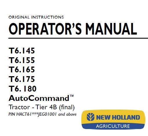 This is Complete Operator’s Manual for New Holland T6.145, T6.155, T6.165, T6.175, T6. 180 AutoCommand Tier 4B (final) Tractor.