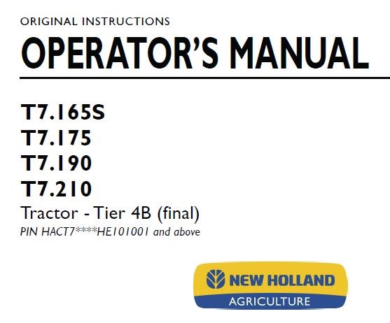 This is Complete Operator’s Manual for New Holland T7.165S, T7.175, T7.190, T7.210 Tier 4B (final) Tractor.