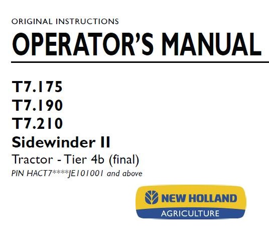 This is Complete Operator’s Manual for New Holland T7.175, T7.190, T7.210 Sidewinder II Tier 4b (final) Tractor.