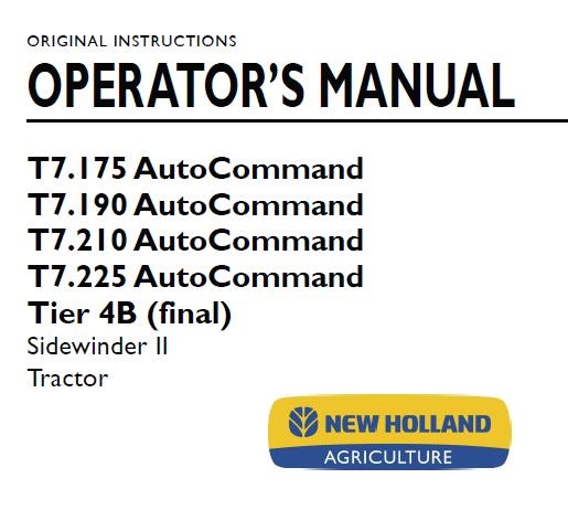 This is Complete Operator’s Manual for New Holland T7.175, T7.190, T7.210, T7.225 Tier 4B (final) Sidewinder II AutoCommand Tractor.