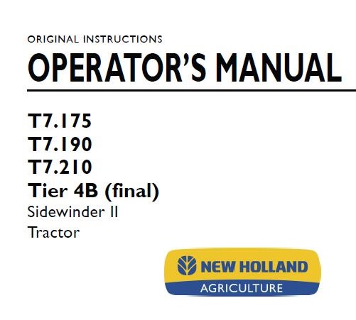 This is Complete Operator’s Manual for New Holland T7.175, T7.190, T7.210, Tier 4B (final) Sidewinder II Tractor.