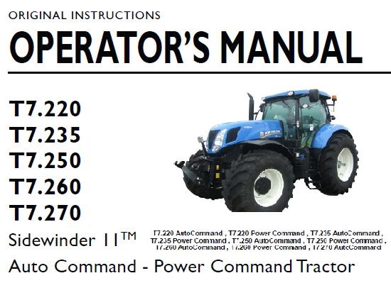 This is Complete Operator’s Manual for New Holland T7.220, T7.235, T7.250, T7.260, T7.270 Sidewinder 11TM Auto Command – Power Command Tractor.