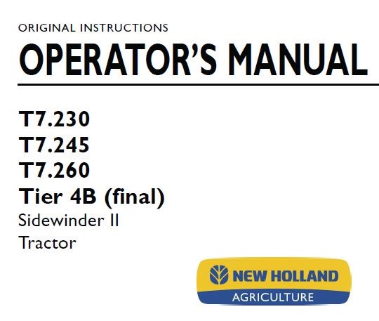 This is Complete Operator’s Manual for New Holland T7.230, T7.245, T7.260 Tier 4B (final) Sidewinder II Tractor.