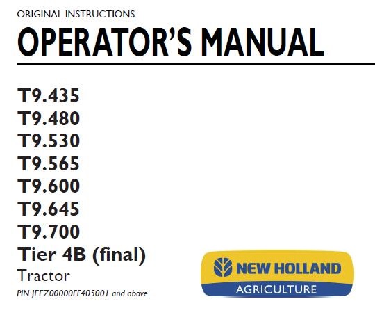 This is Complete Operator’s Manual for New Holland T9.435, T9.480, T9.530, T9.565, T9.600, T9.645, T9.700 Tier 4B (final) Tractor.