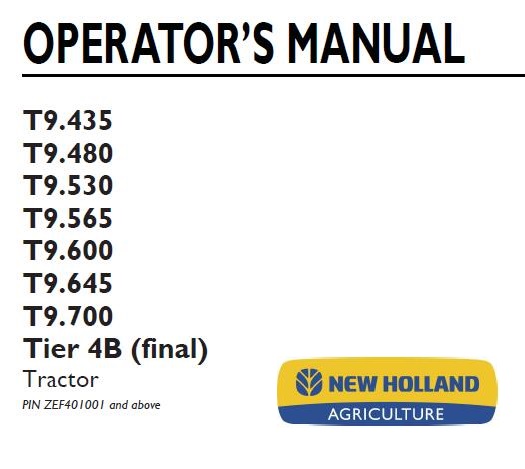 This is Complete Operator’s Manual for New Holland T9.435, T9.480, T9.530, T9.565, T9.600, T9.645, T9.700 Tier 4B (final) Tractor.