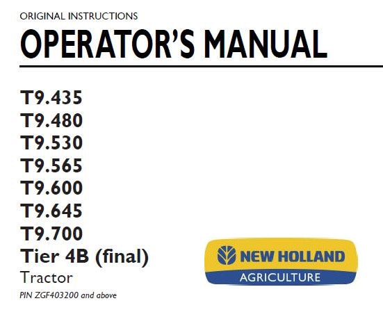 This is Complete Operator’s Manual for New Holland T9.435, T9.480, T9.530, T9.565, T9.600, T9.645, T9.700 Tier 4B (final) Tractor.
