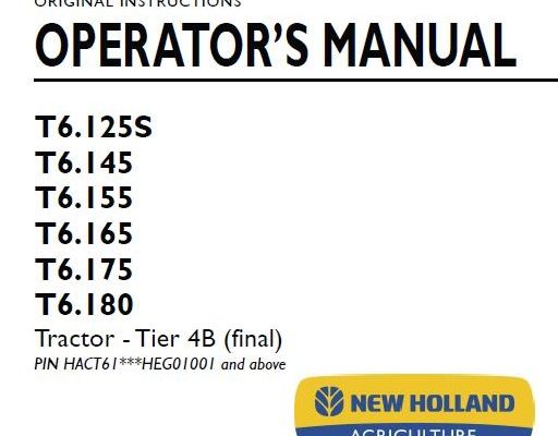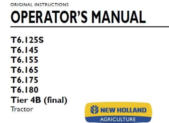 This is Complete Operator's Manual for New Holland T6.125S, T6.145, T6.155, T6.165, T6.175, T6.180 Tier 4B (final) Tractor . Your machine has been designed and built to the highest…