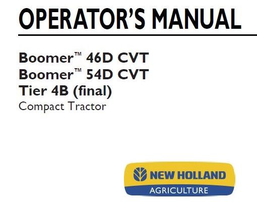 This is Complete Operator's Manual for New Holland Boomer 46D CVT, Boomer 54D CVT Tier 4B (final) Compact Tractor. Your machine has been designed and built to the highest…