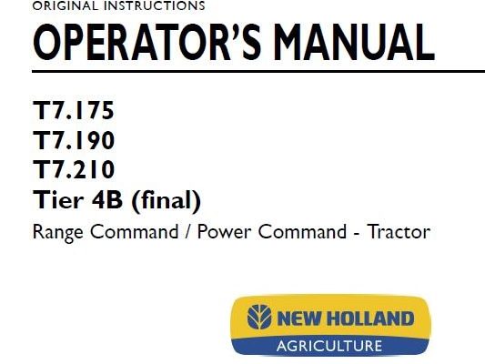 New Holland T7.175, T7.190, T7.210 Tier 4B (final) Range Command / Power Command – Tractor Operator’s Manual