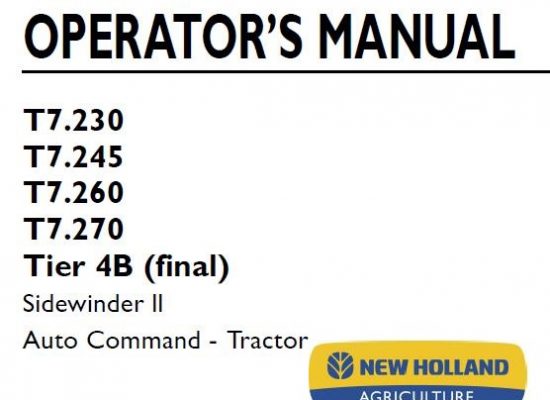 This is Complete Operator's Manual for New Holland T7.230, T7.245, T7.260, Tier 4B (final) Sidewinder II Auto Command Tractor . Your machine has been designed and built to the…