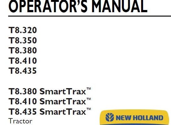 This is Complete Operator's Manual for New Holland T8.320, T8.350, T8.380, T8.410, T8.435, T8.380 SmartTrax, T8.410 SmartTrax, T8.435 SmartTrax Tractor . Your machine has been designed and built to…