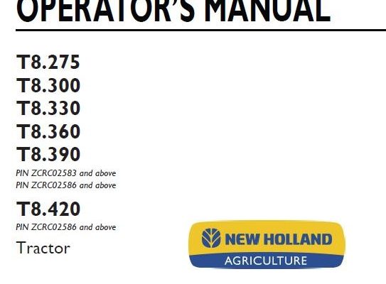 New Holland T8.275, T8.300, T8.330, T8.360, T8.390, T8.420 Tractor Operator’s Manual ( PIN ZCRC02583 and above, ZCRC02586 and above, PIN ZCRC02586 and above )