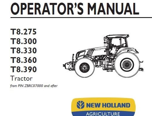 New Holland T8.275, T8.300, T8.330, T8.360, T8.390 Tractor Operator’s Manual (from PIN ZBRC07000 and after)